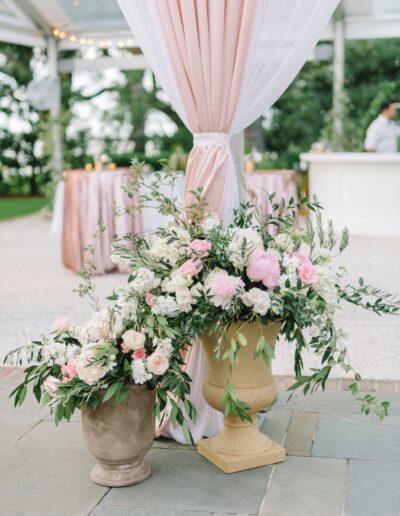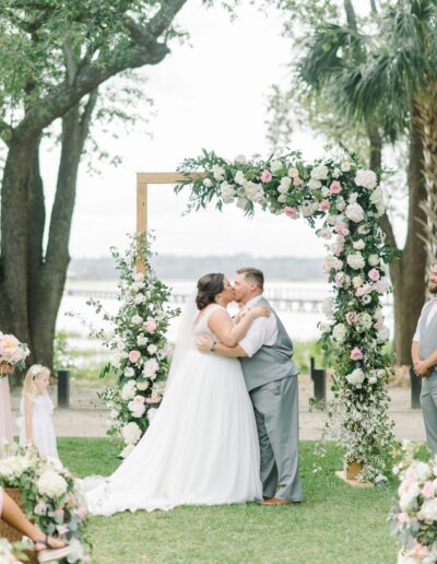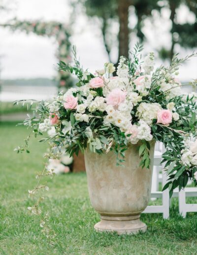 Ceremony arch filled with asymmetrical focal flowers.  Over the top column style pew markers down the aisle! We repurposed all the altar flowers throughout the reception!